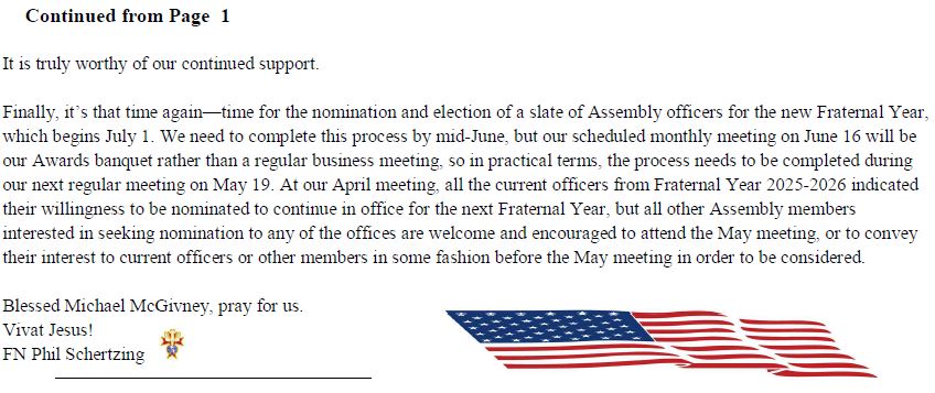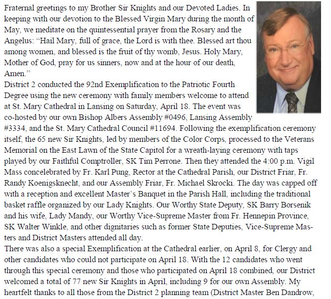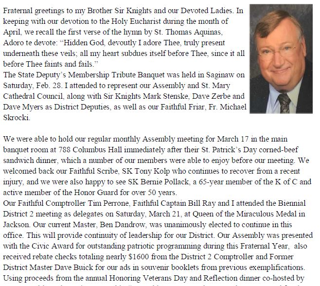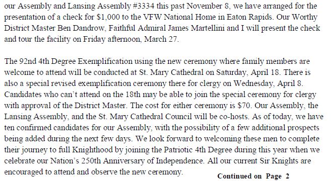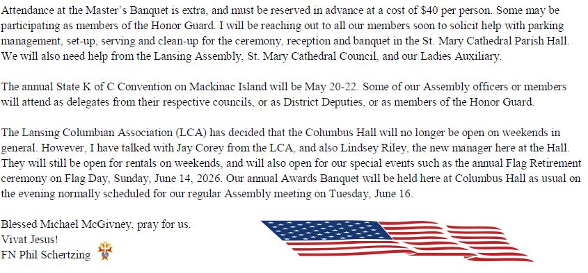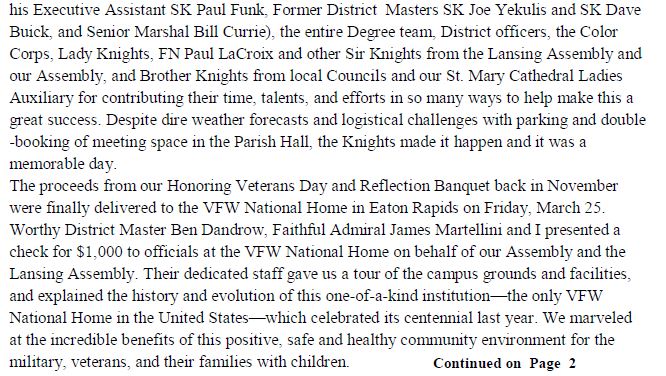We Pride ourselves in being a Catholic men’s organization that is involved in Civil Activities and Works of Goodwill, here and in the Lansing area. Our presence is noted in the Color Corps, with Honor-guard ceremonies, Chalice presentations, Civic support functions, and a highly visible presence for the Catholic Church. A Brotherhood of like believers that worship in kind, we stand firmly in support of our Clergy, of our Faith.. While we are Ready to Assist any we can, we Know that our fellow Brothers in Christ can be Counted on for any help we may need. This source of Confidence Strengthens our individual Efforts and lends itself to the Greater Good..